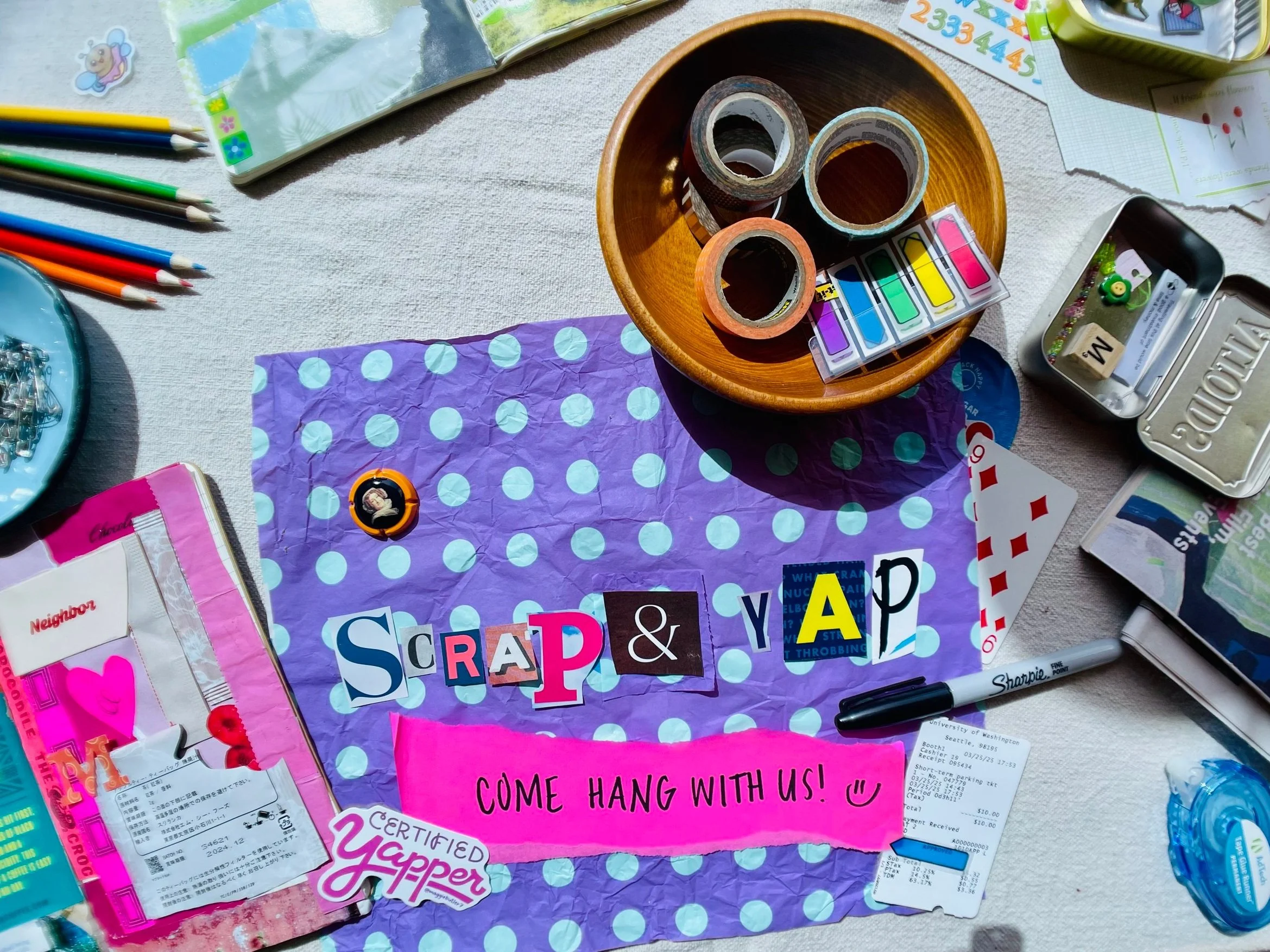 I am a teaching artist at Art Club, where I lead a monthly workshop called Scrap & Yap. Current calendar of classes and event tickets can be found here.